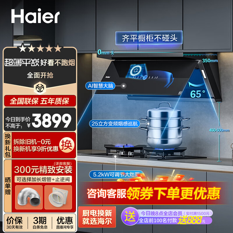 海尔(Haier)抽油烟机 超薄近吸烟灶套装 25m3/min变频有效风顶侧双吸外观 家用吸油烟机燃气灶具C21U1+Q7BE3天价格:3899.00元!