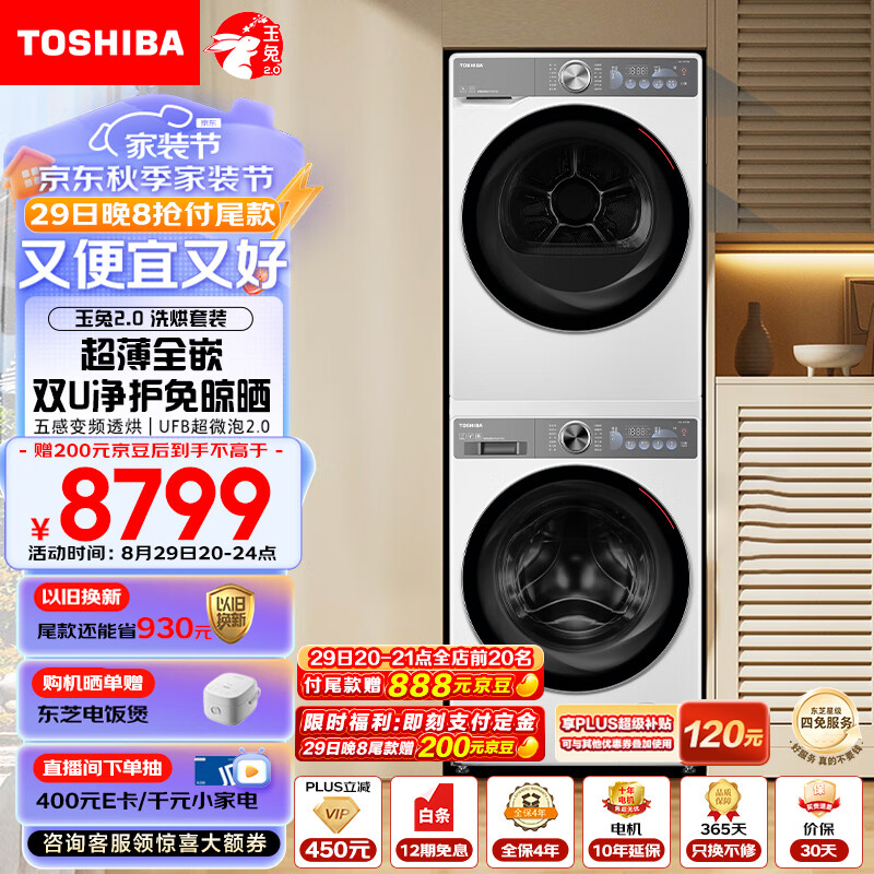 东芝(TOSHIBA)玉兔2.0洗烘套装DG-10T19B+DH-10T19B 超薄全嵌10KG全自动滚筒洗衣机+10KG热泵式变频烘干机除毛絮价格:8998.00元!