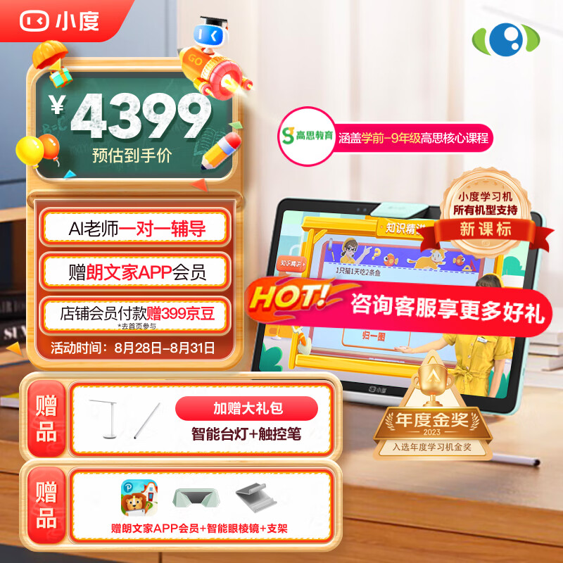 小度学习机Z20Plus高思2024升级版(6+256G)小学到高中学生平板电脑 文心大模型 AI精准学 郎文家 护眼价格:4399.00元!
