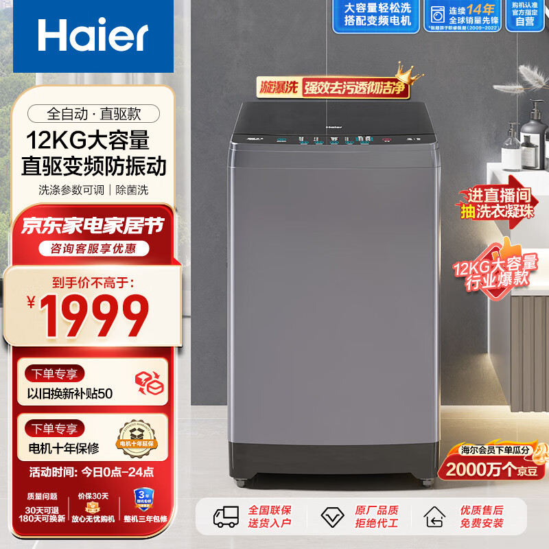 海尔(Haier)波轮洗衣机全自动 12公斤大容量 漩瀑洗高洁净 直驱变频 电离除菌 羽绒洗 以旧换新EB120B35Mate3价格:1999.00元!